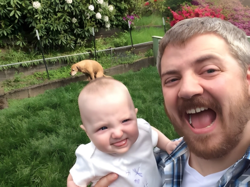 Have you ever seen a photo that resembles a dog pooping on a baby's head? It clashes with the peaceful garden scene but is still hilarious. Usually, a pooping dog does not improve a photo, but here it appears like the tiny dog is sitting on the baby's head. That is one for the family album.